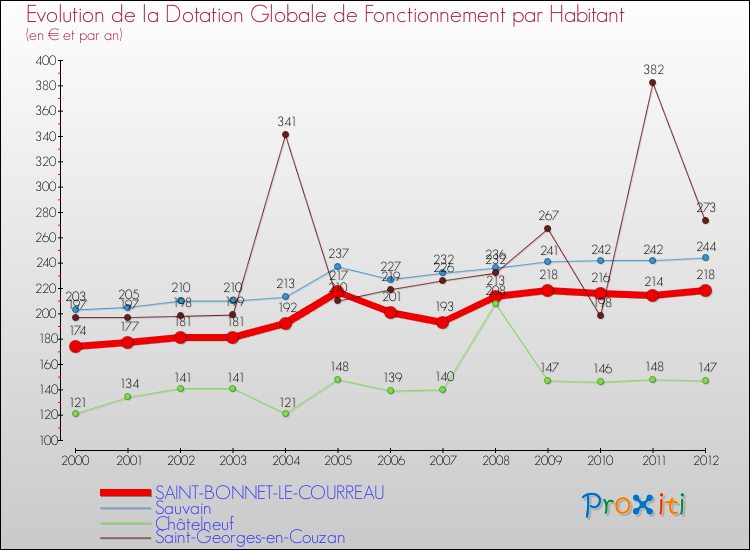 Dans le même temps, la Dotation Globale de Fonctionnement accordée aux communes françaises similaires à Saint-Bonnet-le-Courreau était de 173 € par habitant, en 2012.