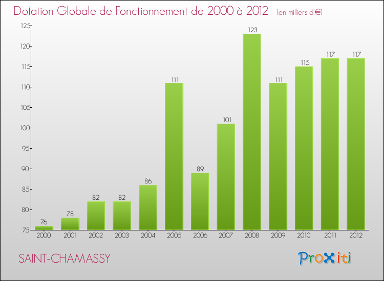 En effet, la dotation globale de fonctionnement versée par l'état en 2012 à la seule commune de Saint-Chamassy était de : 117 000 € au total.