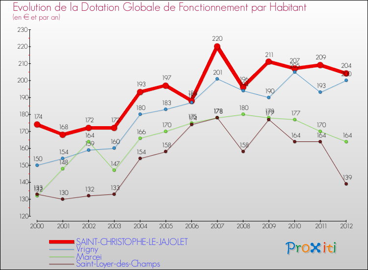 Dans le même temps, la Dotation Globale de Fonctionnement accordée aux communes françaises similaires à Saint-Christophe-le-Jajolet était de 181 € par habitant, en 2012.