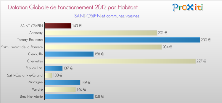 Le graphique ci dessous indique la Dotation Globale de Fonctionnement accordée par habitant à Saint-Crépin en 2012 par rapport aux communes voisines.