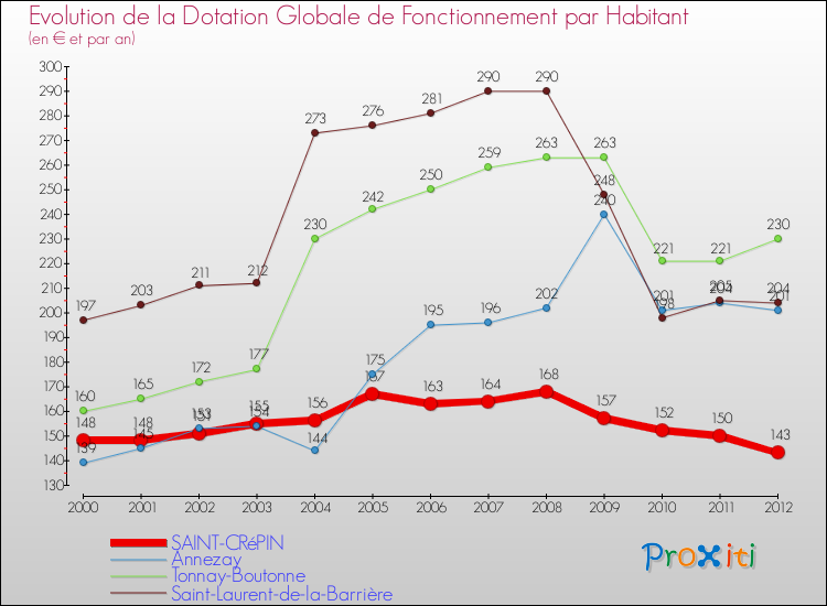 Dans le même temps, la Dotation Globale de Fonctionnement accordée aux communes françaises similaires à Saint-Crépin était de 181 € par habitant, en 2012.
