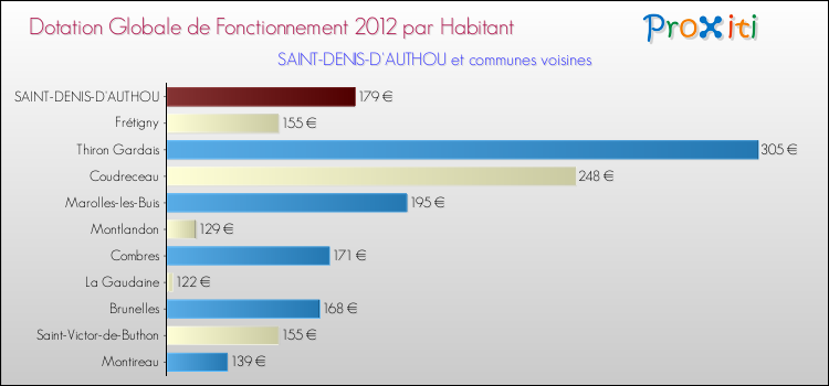Le graphique ci dessous indique la Dotation Globale de Fonctionnement accordée par habitant à Saint-Denis-d'Authou en 2012 par rapport aux communes voisines.