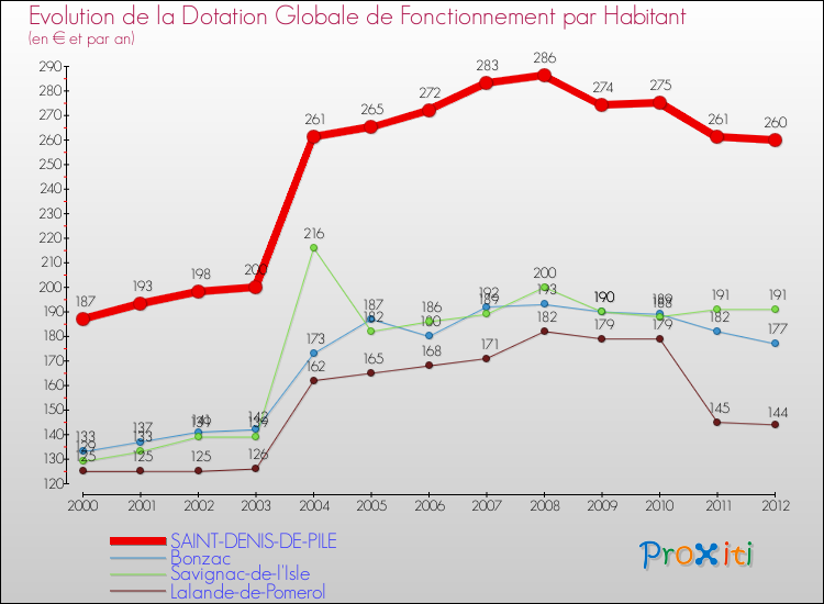Dans le même temps, la Dotation Globale de Fonctionnement accordée aux communes françaises similaires à Saint-Denis-de-Pile était de 203 € par habitant, en 2012.