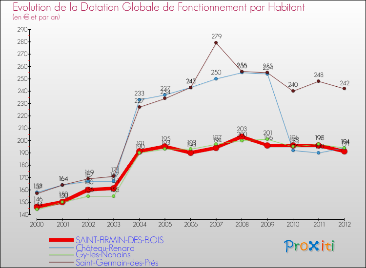 Dans le même temps, la Dotation Globale de Fonctionnement accordée aux communes françaises similaires à Saint-Firmin-des-Bois était de 181 € par habitant, en 2012.