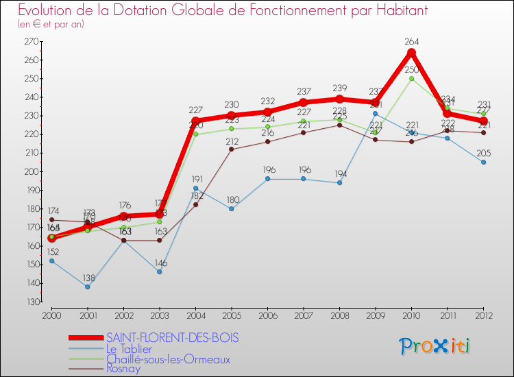 Dans le même temps, la Dotation Globale de Fonctionnement accordée aux communes françaises similaires à Saint-Florent-des-Bois était de 183 € par habitant, en 2012.