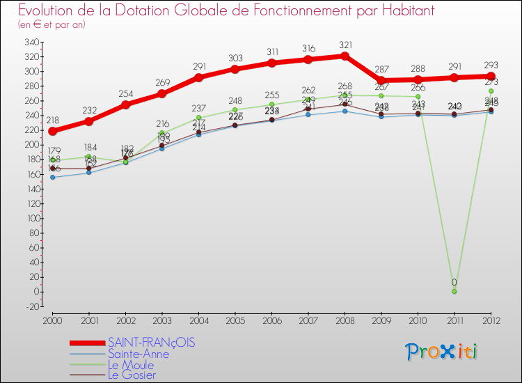 Dans le même temps, la Dotation Globale de Fonctionnement accordée aux communes françaises similaires à Saint-François était de 317 € par habitant, en 2012.