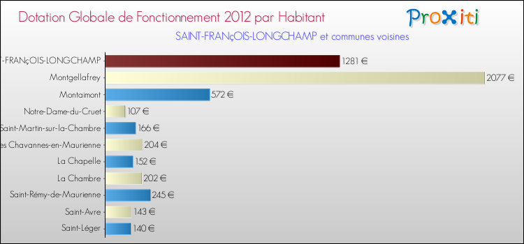 Le graphique ci dessous indique la Dotation Globale de Fonctionnement accordée par habitant à Saint-François-Longchamp en 2012 par rapport aux communes voisines.
