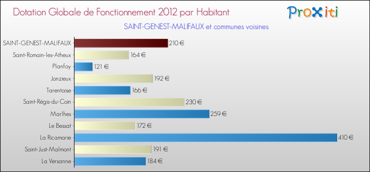 Le graphique ci dessous indique la Dotation Globale de Fonctionnement accordée par habitant à Saint-Genest-Malifaux en 2012 par rapport aux communes voisines.