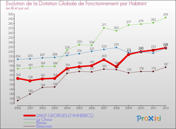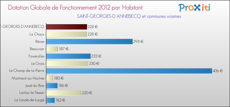 Le graphique ci dessous indique la Dotation Globale de Fonctionnement accordée par habitant à Saint-Georges-d'Annebecq en 2012 par rapport aux communes voisines.