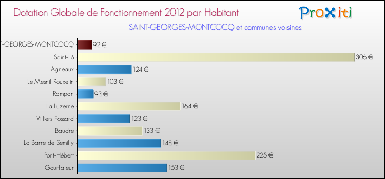 Le graphique ci dessous indique la Dotation Globale de Fonctionnement accordée par habitant à Saint-Georges-Montcocq en 2012 par rapport aux communes voisines.