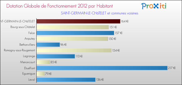 Le graphique ci dessous indique la Dotation Globale de Fonctionnement accordée par habitant à Saint-Germain-le-Châtelet en 2012 par rapport aux communes voisines.