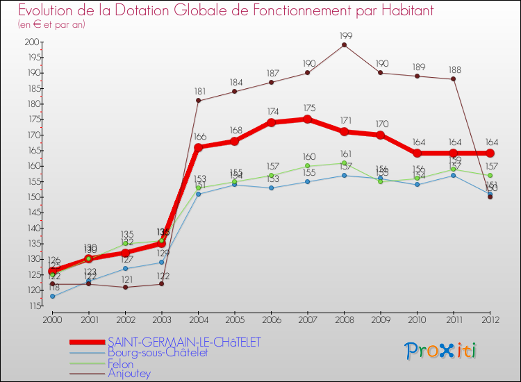 Dans le même temps, la Dotation Globale de Fonctionnement accordée aux communes françaises similaires à Saint-Germain-le-Châtelet était de 173 € par habitant, en 2012.