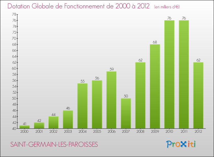 Dans le même temps, la Dotation Globale de Fonctionnement accordée aux communes françaises similaires à Saint-Germain-les-Paroisses était de 200 € par habitant, en 2012.