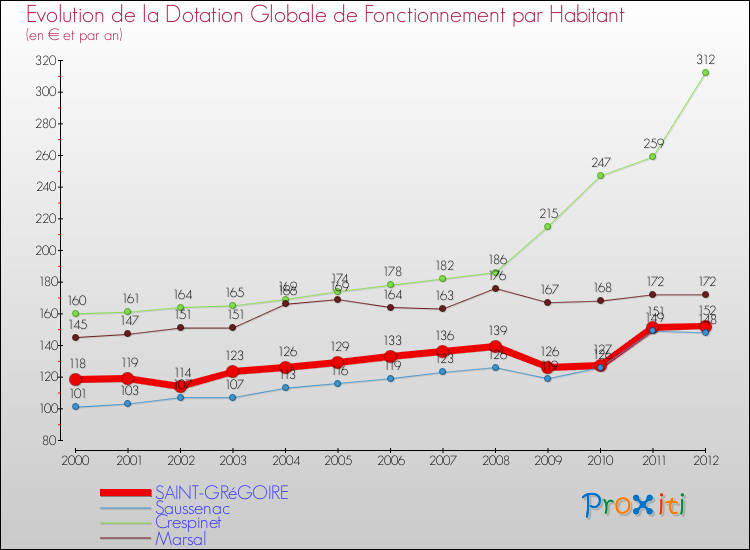 Dans le même temps, la Dotation Globale de Fonctionnement accordée aux communes françaises similaires à Saint-Grégoire était de 200 € par habitant, en 2012.