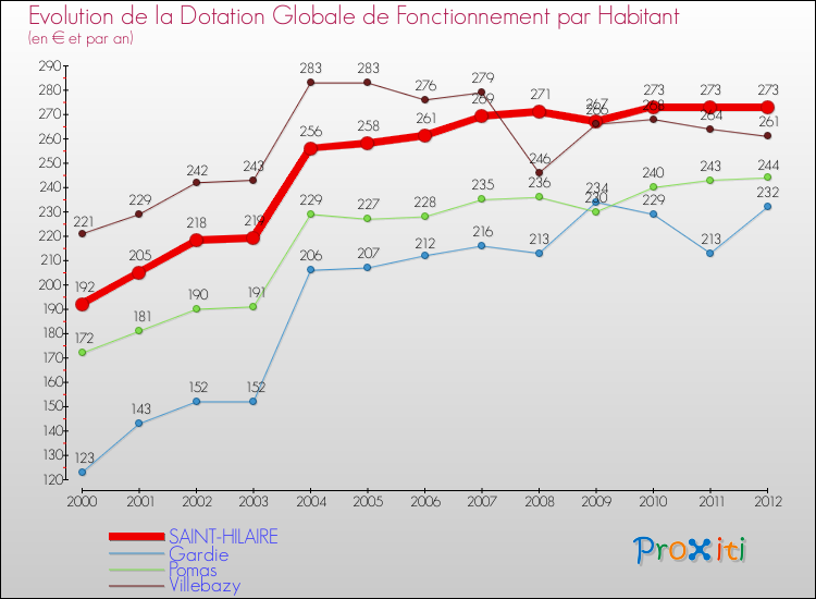 Dans le même temps, la Dotation Globale de Fonctionnement accordée aux communes françaises similaires à Saint-Hilaire était de 173 € par habitant, en 2012.
