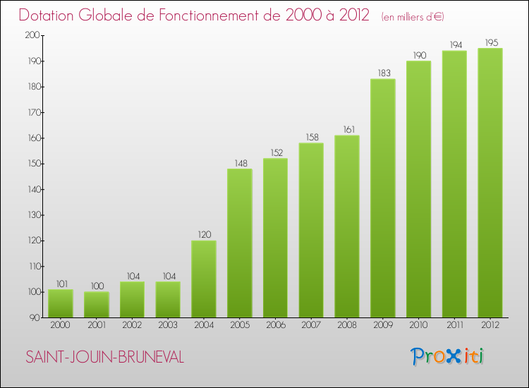 Dans le même temps, la Dotation Globale de Fonctionnement accordée aux communes françaises similaires à Saint-Jouin-Bruneval était de 214 € par habitant, en 2012.