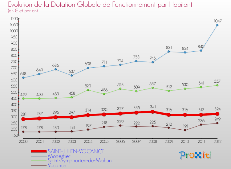 Le graphique ci dessous indique la Dotation Globale de Fonctionnement accordée par habitant à Saint-Julien-Vocance en 2012 par rapport aux communes voisines.