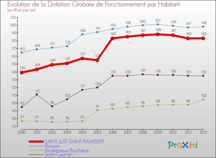 Le graphique ci dessous indique la Dotation Globale de Fonctionnement accordée par habitant à Saint-Just-Saint-Rambert en 2012 par rapport aux communes voisines.