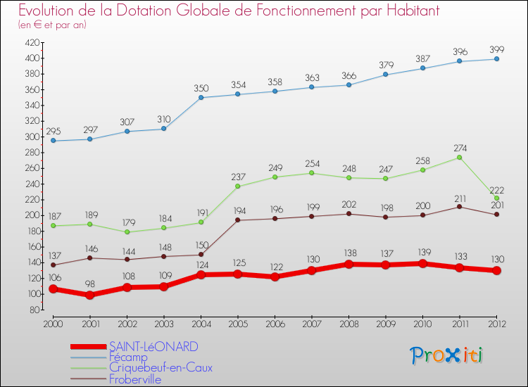 Dans le même temps, la Dotation Globale de Fonctionnement accordée aux communes françaises similaires à Saint-Léonard était de 173 € par habitant, en 2012.