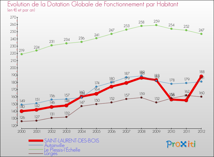 Dans le même temps, la Dotation Globale de Fonctionnement accordée aux communes françaises similaires à Saint-Laurent-des-Bois était de 181 € par habitant, en 2012.