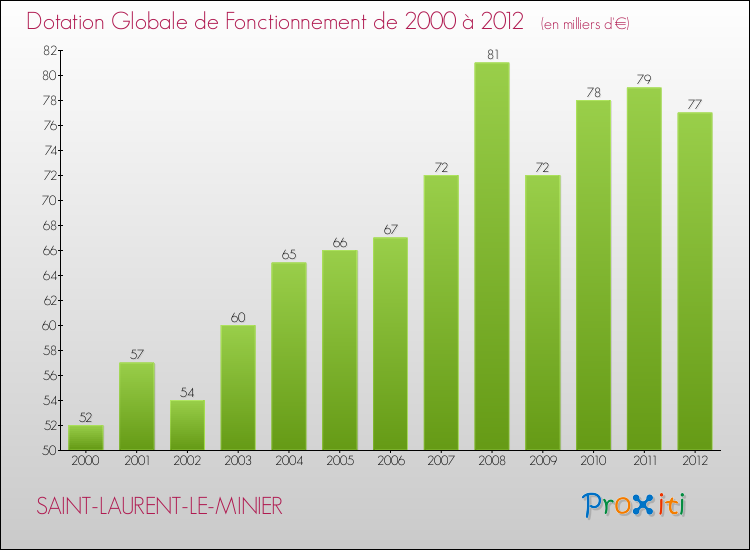 Dans le même temps, la Dotation Globale de Fonctionnement accordée aux communes françaises similaires à Saint-Laurent-le-Minier était de 181 € par habitant, en 2012.