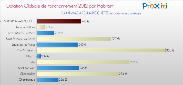 Le graphique ci dessous indique la Dotation Globale de Fonctionnement accordée par habitant à Saint-Médard-la-Rochette en 2012 par rapport aux communes voisines.