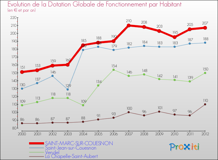 Le graphique ci dessous indique la Dotation Globale de Fonctionnement accordée par habitant à Saint-Marc-sur-Couesnon en 2012 par rapport aux communes voisines.
