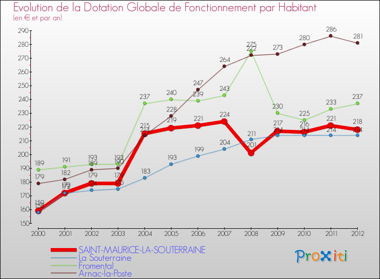 Dans le même temps, la Dotation Globale de Fonctionnement accordée aux communes françaises similaires à Saint-Maurice-la-Souterraine était de 173 € par habitant, en 2012.