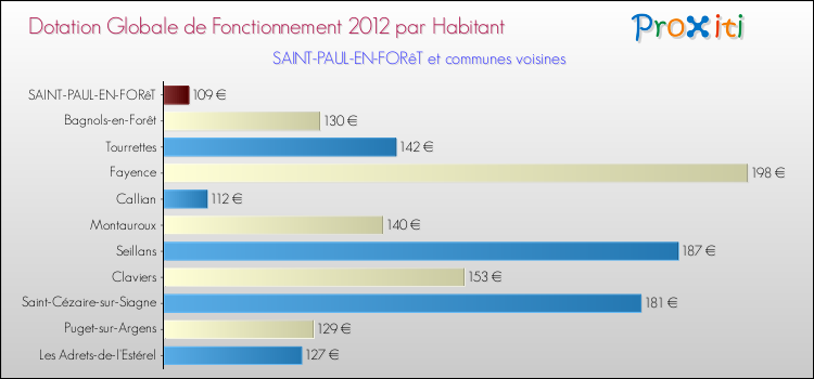 Le graphique ci dessous indique la Dotation Globale de Fonctionnement accordée par habitant à Saint-Paul-en-Forêt en 2012 par rapport aux communes voisines.