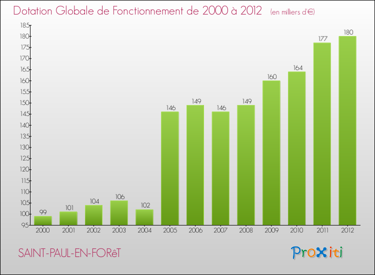 Dans le même temps, la Dotation Globale de Fonctionnement accordée aux communes françaises similaires à Saint-Paul-en-Forêt était de 214 € par habitant, en 2012.