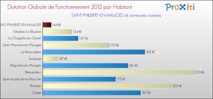 Le graphique ci dessous indique la Dotation Globale de Fonctionnement accordée par habitant à Saint-Philbert-en-Mauges en 2012 par rapport aux communes voisines.