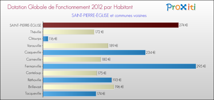 Le graphique ci dessous indique la Dotation Globale de Fonctionnement accordée par habitant à Saint-Pierre-Église en 2012 par rapport aux communes voisines.
