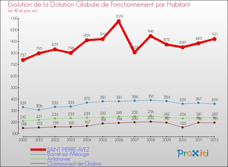 Le graphique ci dessous indique la Dotation Globale de Fonctionnement accordée par habitant à Saint-Pierre-Avez en 2012 par rapport aux communes voisines.