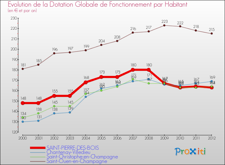 Dans le même temps, la Dotation Globale de Fonctionnement accordée aux communes françaises similaires à Saint-Pierre-des-Bois était de 232 € par habitant, en 2012.