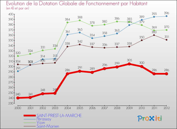 Le graphique ci dessous indique la Dotation Globale de Fonctionnement accordée par habitant à Saint-Priest-la-Marche en 2012 par rapport aux communes voisines.