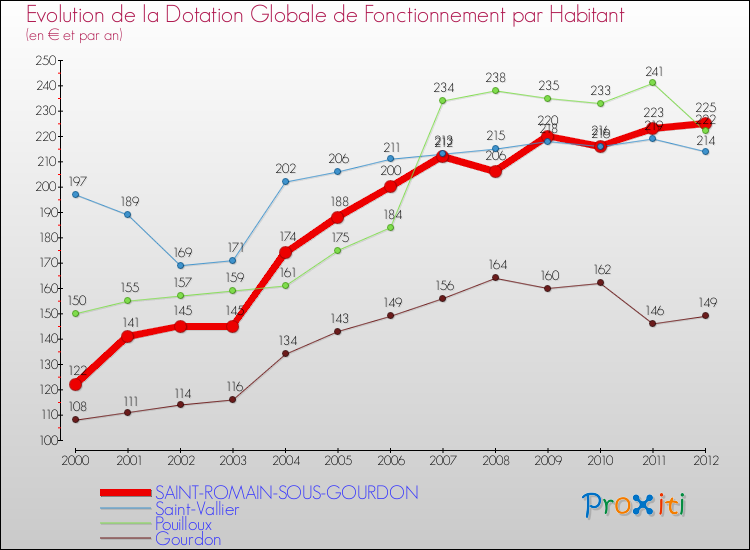 Dans le même temps, la Dotation Globale de Fonctionnement accordée aux communes françaises similaires à Saint-Romain-sous-Gourdon était de 214 € par habitant, en 2012.