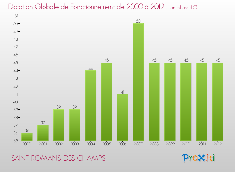 En effet, la dotation globale de fonctionnement versée par l'état en 2012 à la seule commune de Saint-Romans-des-Champs était de : 45 000 € au total.