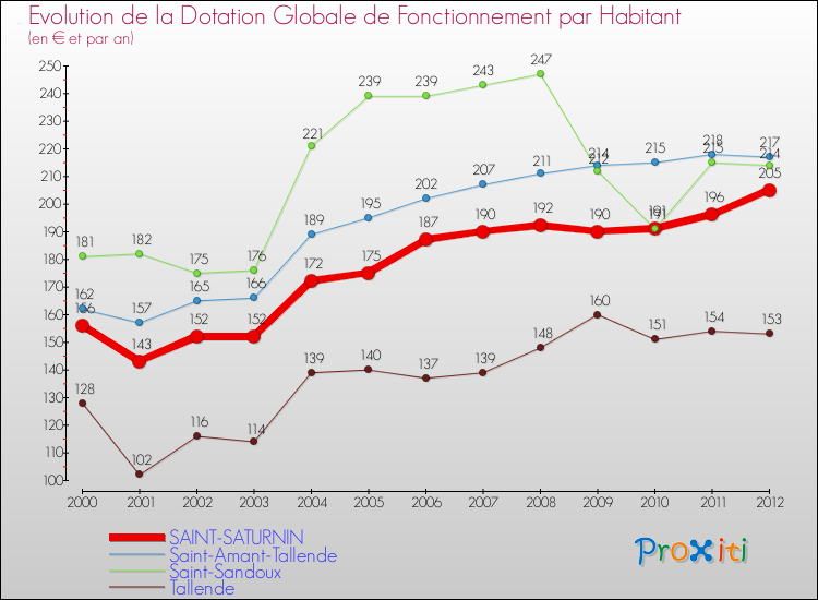 Dans le même temps, la Dotation Globale de Fonctionnement accordée aux communes françaises similaires à Saint-Saturnin était de 173 € par habitant, en 2012.