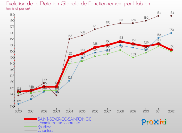 Dans le même temps, la Dotation Globale de Fonctionnement accordée aux communes françaises similaires à Saint-Sever-de-Saintonge était de 173 € par habitant, en 2012.