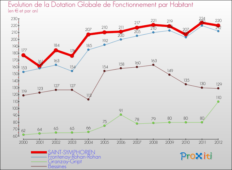 Dans le même temps, la Dotation Globale de Fonctionnement accordée aux communes françaises similaires à Saint-Symphorien était de 173 € par habitant, en 2012.