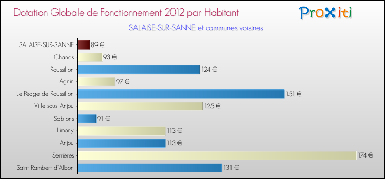 Le graphique ci dessous indique la Dotation Globale de Fonctionnement accordée par habitant à Salaise-sur-Sanne en 2012 par rapport aux communes voisines.