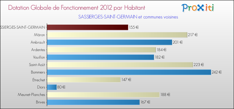 Le graphique ci dessous indique la Dotation Globale de Fonctionnement accordée par habitant à Sassierges-Saint-Germain en 2012 par rapport aux communes voisines.
