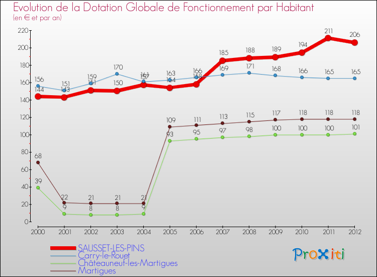 Dans le même temps, la Dotation Globale de Fonctionnement accordée aux communes françaises similaires à Sausset-les-Pins était de 203 € par habitant, en 2012.