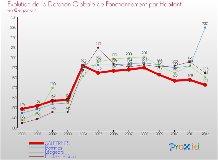 Dans le même temps, la Dotation Globale de Fonctionnement accordée aux communes françaises similaires à Sauternes était de 173 € par habitant, en 2012.