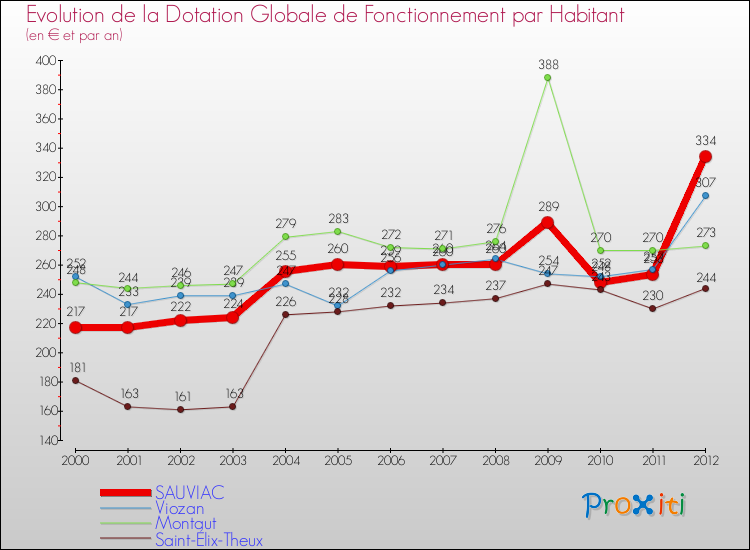 Dans le même temps, la Dotation Globale de Fonctionnement accordée aux communes françaises similaires à Sauviac était de 232 € par habitant, en 2012.