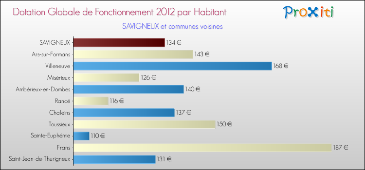 Le graphique ci dessous indique la Dotation Globale de Fonctionnement accordée par habitant à Savigneux en 2012 par rapport aux communes voisines.
