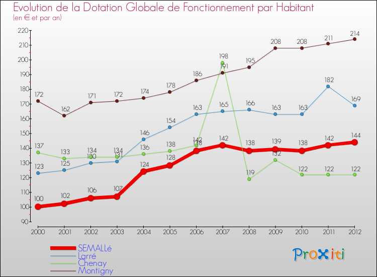 Dans le même temps, la Dotation Globale de Fonctionnement accordée aux communes françaises similaires à Semallé était de 200 € par habitant, en 2012.