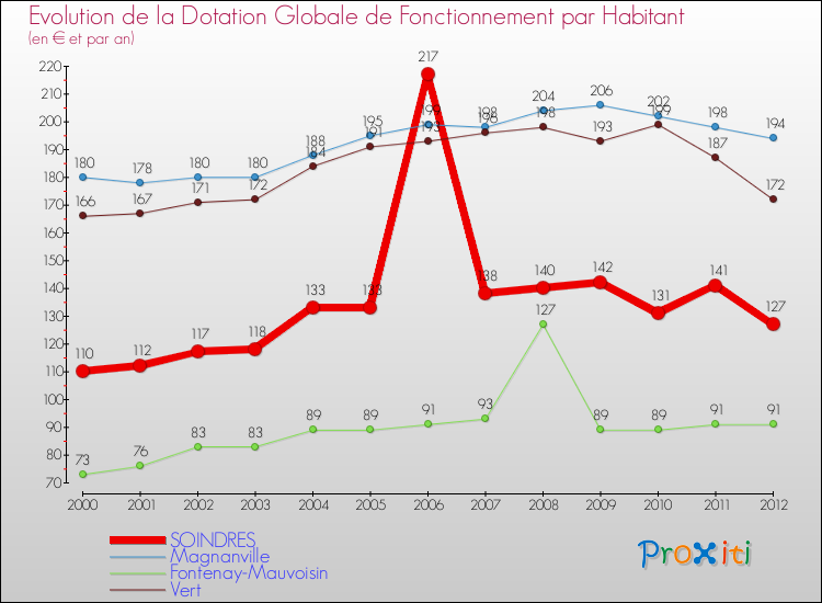 Dans le même temps, la Dotation Globale de Fonctionnement accordée aux communes françaises similaires à Soindres était de 173 € par habitant, en 2012.