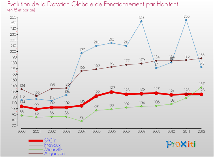 Dans le même temps, la Dotation Globale de Fonctionnement accordée aux communes françaises similaires à Spoy était de 232 € par habitant, en 2012.