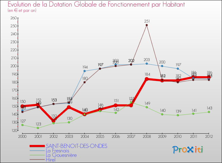 Dans le même temps, la Dotation Globale de Fonctionnement accordée aux communes françaises similaires à Saint-Benoît-des-Ondes était de 173 € par habitant, en 2012.